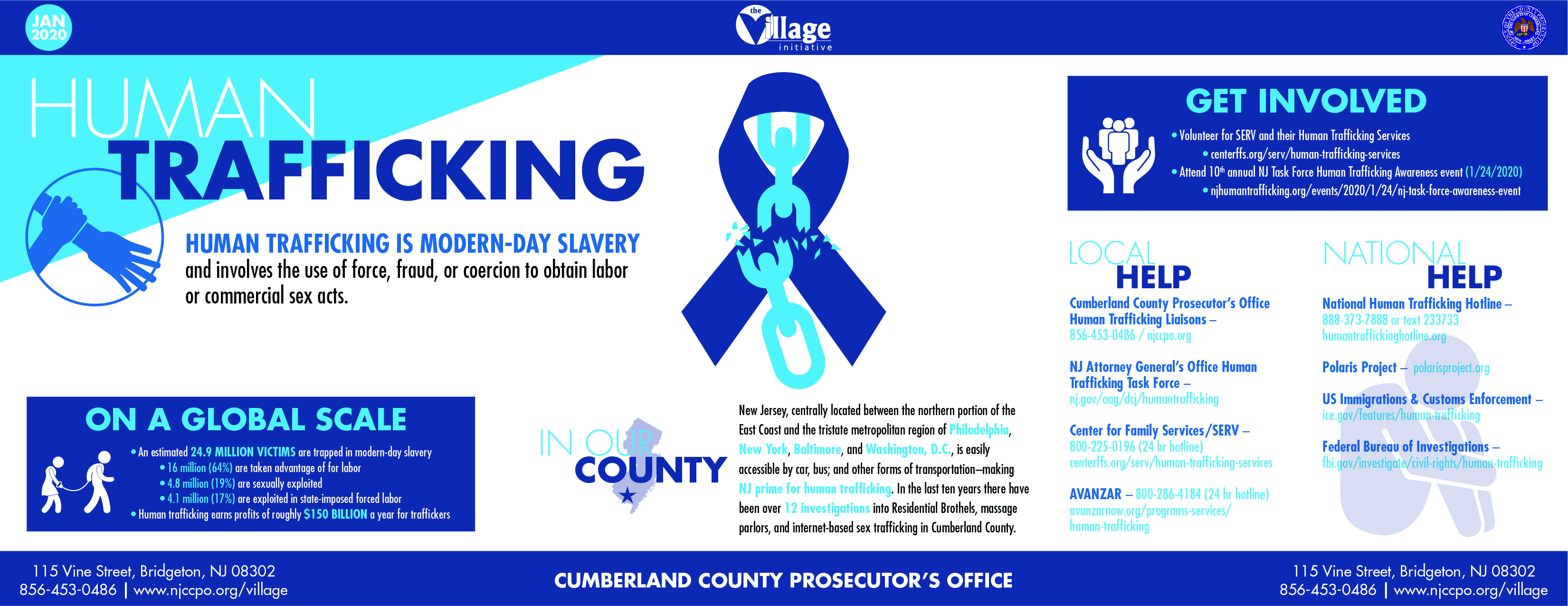 Human trafficking is exploiting someone through the use of force or deception to work against their will. Cumberland County is not immune to human trafficking. In the last ten years there have been numerous investigations into residential brothels, massage parlors and internet-based sex trafficking. Check out this month’s factsheet to fight modern-day slavery.